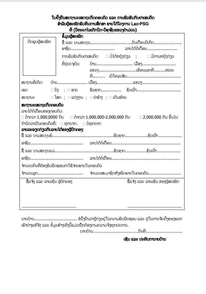 ຜູ້ທີ່ປະສົງຂໍຮັບທຶນ Lao-PSG ຈະຕ້ອງຕື່ມໃບສະໝັກຂໍຮັບທຶນໃຫ້ຄົບຖ້ວນ ແລະ ຖືກຕ້ອງ ພ້ອມແນບເອກະສານທີ່ກ່ຽວຂ້ອງ ເຊັ່ນ: ຂໍ້ມູນສ່ວນຕົວ, ປະຫວັດການສຶກສາ, ສະພາບຄອບຄົວ, ສະພາບທາງເສດຖະກິດ ແລະ ເຫດຜົນໃນການຂໍຮັບທຶນ ເພື່ອໃຫ້ຄະນະພິຈາລະນາທຶນ ນໍາໄປພິຈາລະນາຢ່າງຍຸດຕິທໍາ ແລະ ໂປ່ງໃສ.